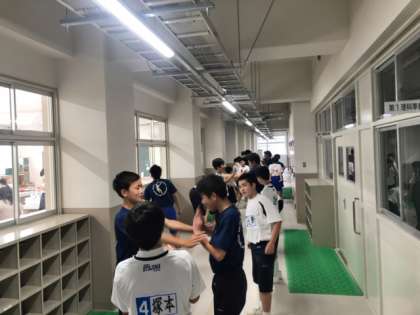 男子テニス部の様子です。1日目はグラウンドでラケットを使っての練習を。今日は廊下でレクリエーションの要素を取り入れながらのトレーニングを行っていました。