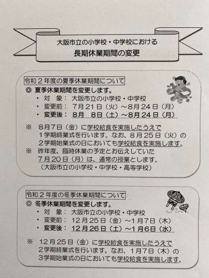 大阪市教育委員会より、令和2年度の長期休業期間の変更並びに教育課程の見直しのリーフレットが届きました。生徒を通じてリーフレットを配付させていただきました。