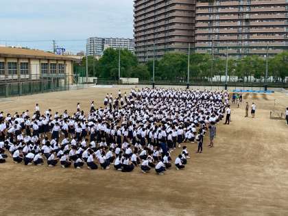 8時15分より全校集会を知らせる音楽放送でグラウンドに集まり、生徒会主導の整列です。8時20分頃にはほぼ整列ができていました。