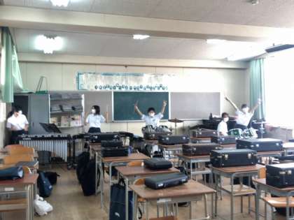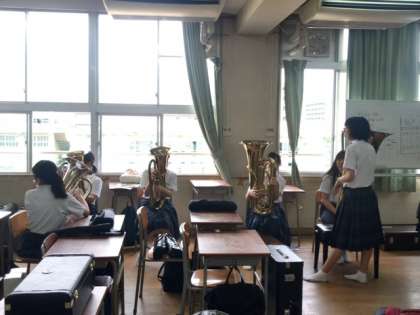 吹奏楽部の様子です。各パートに分かれて練習を行なっています。それぞれの部屋で先輩が一緒に教えながら楽しそうな雰囲気で練習しています。