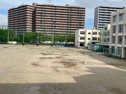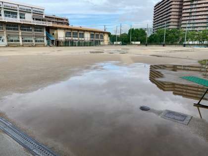 昨夜から今朝にかけての大雨で、グラウンドにも大きな水溜りができています。