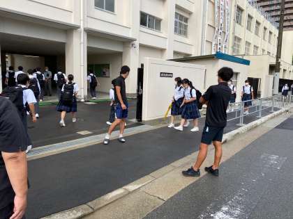 強い雨が生徒たちの登校に支障をきたすのではと心配をしましたが、登校時には雨も止んでいました。傘を持って登校した生徒も多く見かけましたが、使用することなく折りたたんだ状態で、いつも通りの登校ができました。