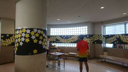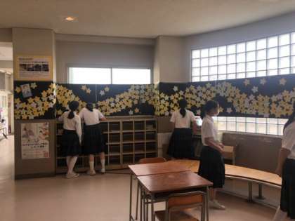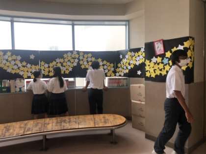 職員室前のピロティでは、先日掲示されたいじめをなくすための行動宣言を集めた天の川をみています。