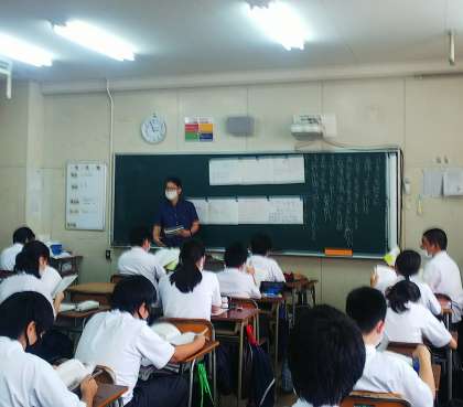 写真は1組での川口先生の授業です。『音を宿す』という題材で、伝統文化の継承や発展について考えています。