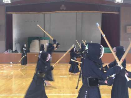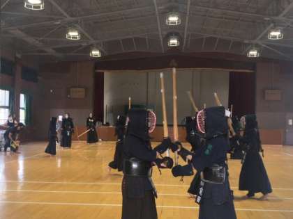 講堂にて剣道が練習しています。1対1での打ち合いを行なっています。竹刀の音が響き渡っています。