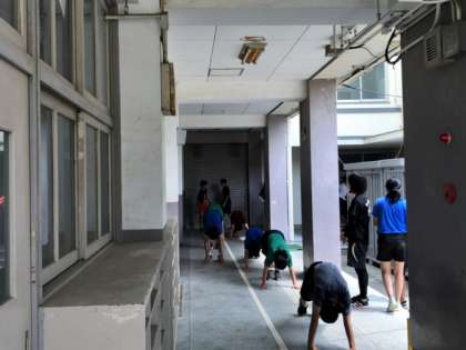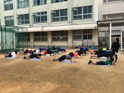 グラウンドでは陸上部が活動しています。補強運動を行い身体の基礎能力を高めています。