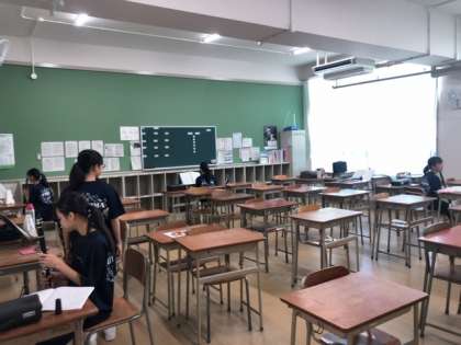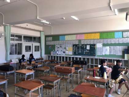 吹奏楽部の様子です。各パートが教室ごとに分かれて練習しています。先輩が後輩に丁寧にアドバイスしながら音を揃えています。