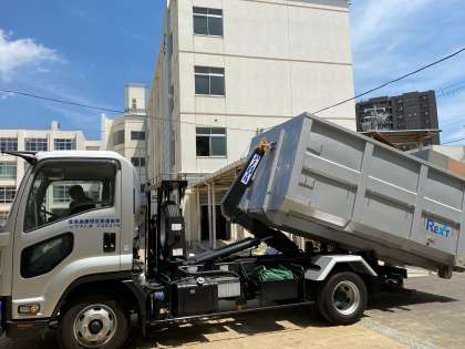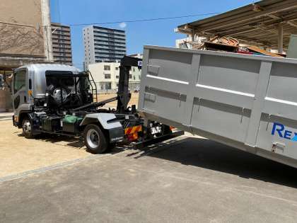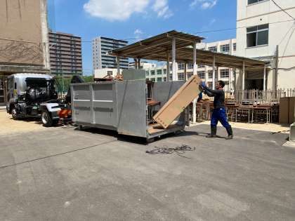 不要になった備品類は、運転手によって無駄なくスムーズにコンテナに積み込まれて行きました。積み込みが終わって地面に置かれたコンテナは、車両のアームロールに引き寄せられて、短時間で荷台に収まっていきました。