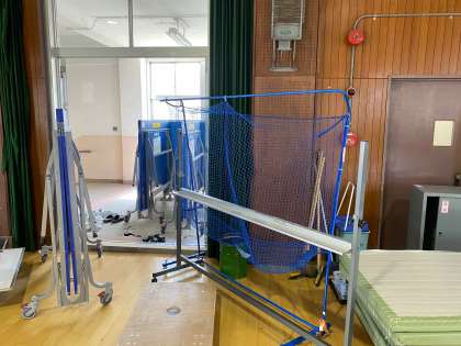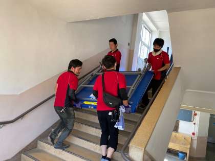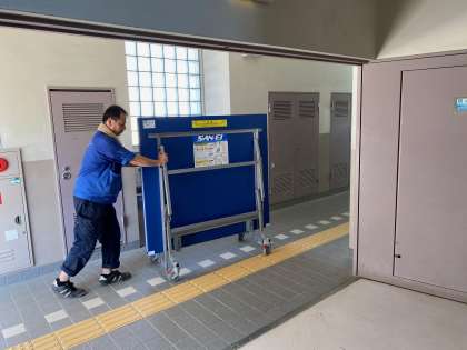 朝から作業が始まり、講堂の物品移動から作業が始まりました。部活動で使用していた10数台の卓球台が降ろされました。新しく今後も使用する台は7号館2・3階へ運ばれ、古くから使用されていたものは正門前の粗大ごみ置き場へ運ばれました。