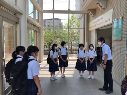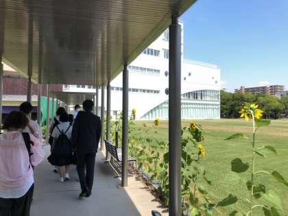 高校の広くて美しいキャンパスに感激しながら担当の先生に案内され校舎を探索しています。