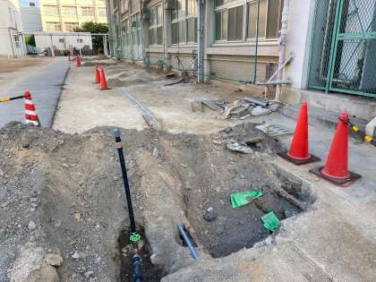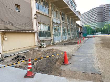 来週から本格的な工事が始まり、グラウンドに工事区域を囲う塀の建設と1号館から体育館へ行くための仮設通路が作られます。工事は一部で始まっており、2・3号館への水道管は止められています。生徒の皆さんには、授業や部活動で迷惑をかけますが、協力方よろしくお願いしますと話されました。