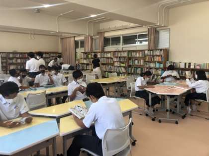 今日からお昼休みが再開され、図書室ではたくさんの生徒が本を選んだり読んだりしています。