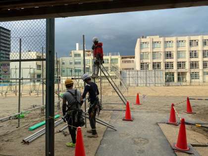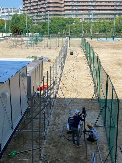 塀の設置工事では、パイプが地中深くまで機械で打ち込まれて、一直線に伸びてグラウンドを2分しています。打込み作業の機械音がリズミカルにグラウンドに響いて、工事が始まったことを知れせています。