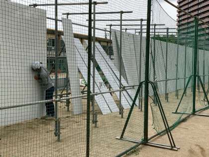 パイプには背が高く丈夫な真っ白なフラットパネル(鋼板塀)が取り付けられていました。生徒の安全を確保するために、部活動で使用している緑色の移動式防球ネットを連ねて並べました。