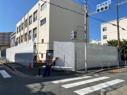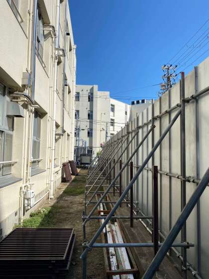 2号館・3号館のプラザ側の歩道沿いにフラットパネルの塀が設置され、工事区域がどんどん覆われていきました。