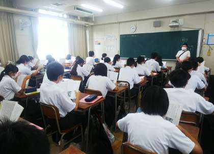 1年生の道徳の授業は、先生が二人一組でチームをつくり、各クラスを順にまわり授業を行っています。