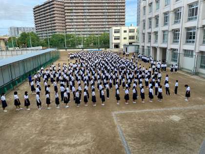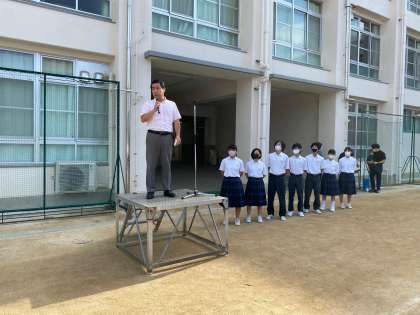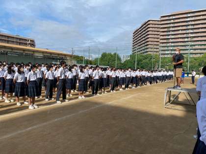 本日の全校集会は、先週までの猛暑から幾分過ごしやすい気温となりました。工事に伴い体育館への仮設通路が設置されましたが、全校集会を行うスペースを確保できグラウンド状態もよく、全校集会を行うことができました