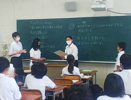 終学活の時間に校内放送で、代表の先生からあいさつがありました。その後、ご指導いただいた各クラスで、生徒からお礼とお別れのあいさつを行いました。写真は1年2組、1年4組のようすです。