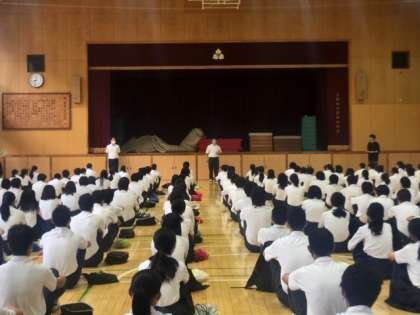 本日朝、3年生は学年集会を行いました。中島区長にお越しいただき、11月8日に行われる西淀川区四中合同模試についてお話しいただきました。