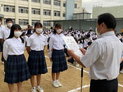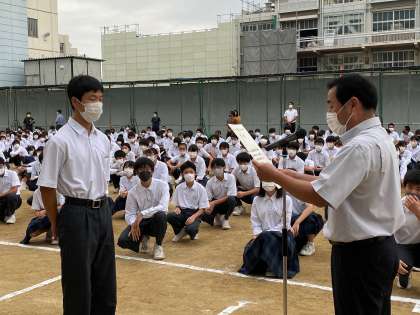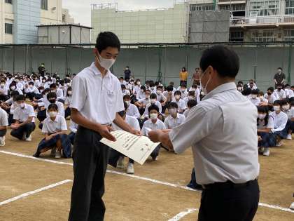 同じく男子バレーボール部も、大阪市秋季総合大会にて3位となりました。メダルの披露もされました。(下の写真)