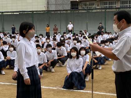 表彰披露は続き、女子剣道部が大阪市秋季総合体育大会で団体3位になりました。(上の写真)
