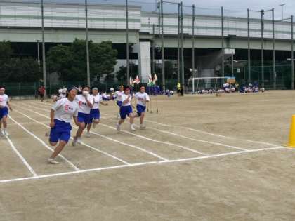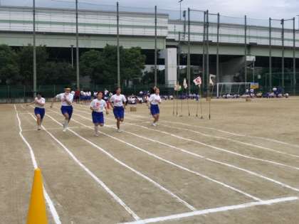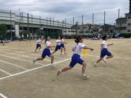 女子の100mがスタートしました。ピストルの音とともに選手たちが勢いよくカーブを曲がっていきます。