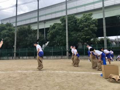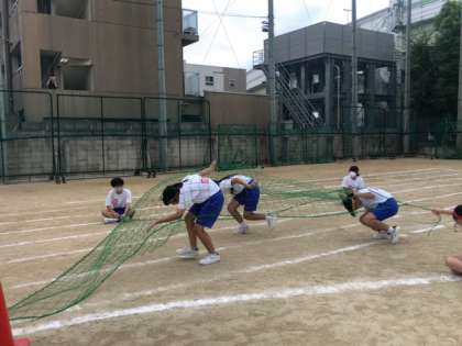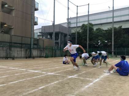 アスレチック走の様子です。フープ通し、袋跳び、網くぐりをクリアしていきます。ゴールまで順位の予想がつきません。