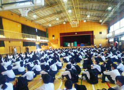 15日の中間テスト終了後、体育館で1、2年生の参加生徒を対象に部活動集会を行いました。