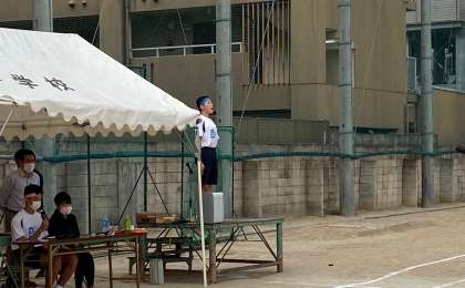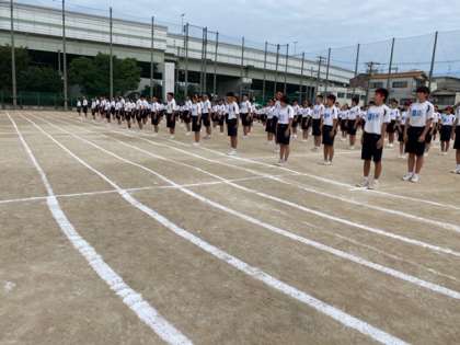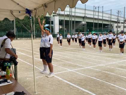 陸上競技大会、開会式の様子です。体育委員の開会宣言、選手宣誓で全体の雰囲気が一気に引き締まりました。