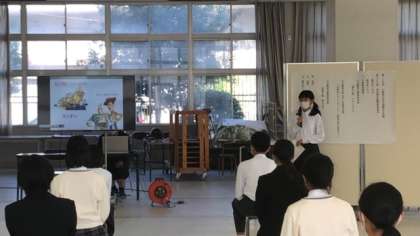 夏休みの新聞を、さらに深く調べ、パワーポイントでまとめて発表しました。参加したのは2年生の2人です。