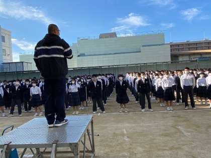 10月26日(月)ややヒンヤリしたグラウンドで全校集会を行いました。