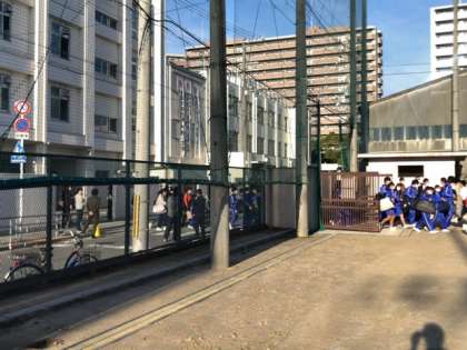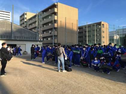 今日から修学旅行がスタートします。天候にも恵まれて、気持ちの良い朝です。生徒のみなさんがグラウンドに集合しています。