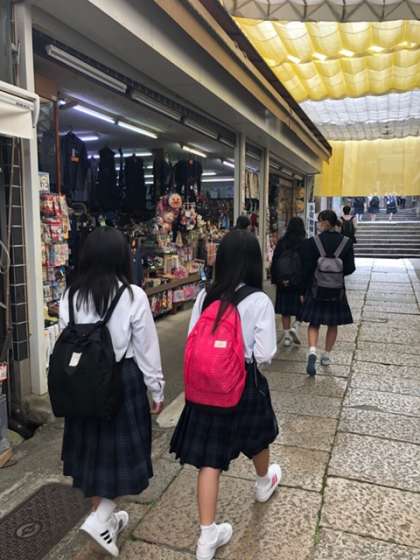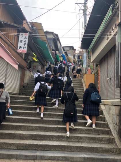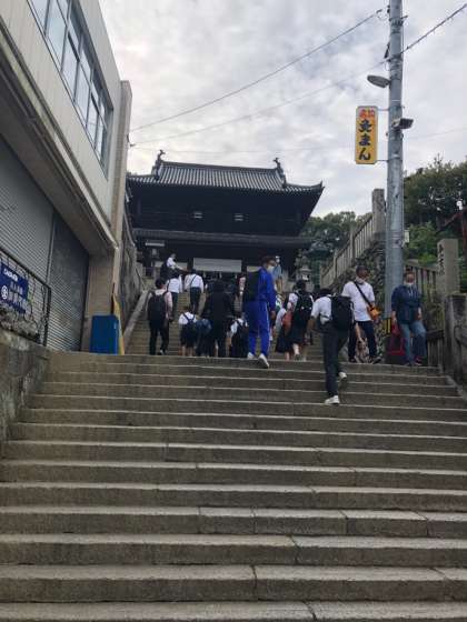 クラスで金比羅山の本堂を目指して登ります。朝の倉敷探索からの階段登りはなかなか大変です。声をかけあいながら登ります。