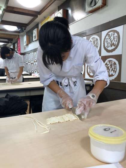 職人さんが丁寧にうどんの練り方、切り方などご指導くださっています。