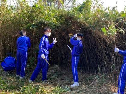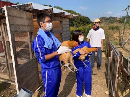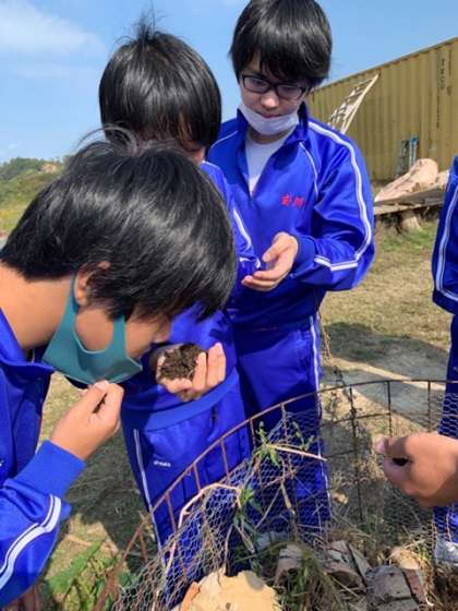 土について学んだあとは、動物にふれたり、竹を切るなどのフィールドワークを行いました。