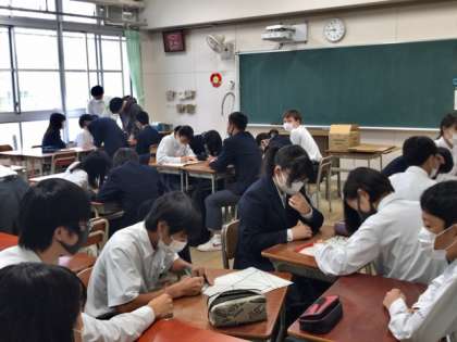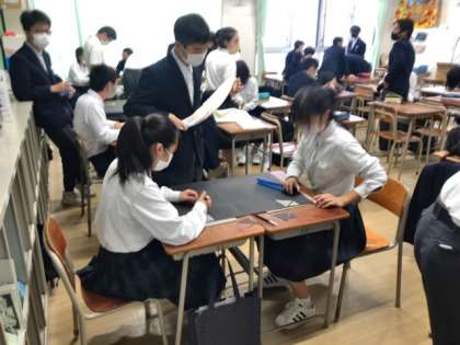 本日1限目、3年生は文化発表会で展示するステンドグラスを製作しています。クラスの代表が考えてくれたアイディアを基に製作しています。
