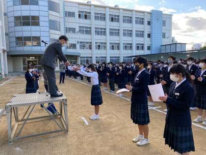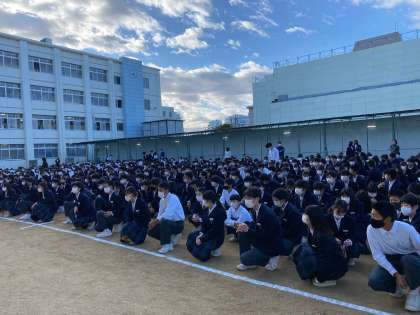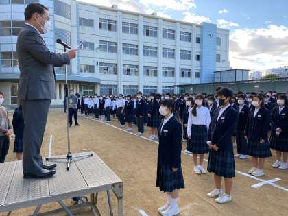 今日は今までの陽気と違い幾分ヒンヤリとしていて、上空の雲も夏の雲から冬空で見かける雲に代わっていました。生徒の服装もポロシャツの白色から、ブレザーの紺色に代わってきていました。生徒達は集合時間前に登校して、自発的に整列し腰を落として待ってくれています。