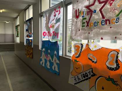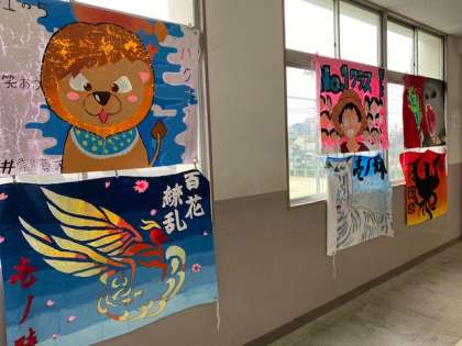 各クラスの学級旗の展示です。学年陸上競技会に向けて制作されていました。それぞれのクラスのカラーが表現されています。