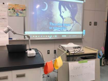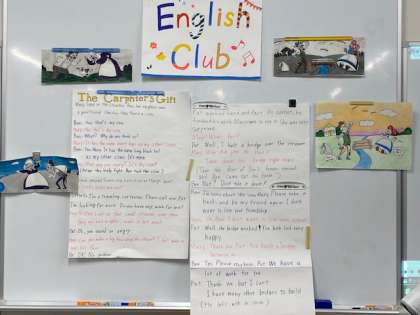 英語部の作品です。ハロウィーンのポストカードや動画の吹き替えなどが展示されています。