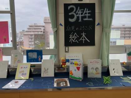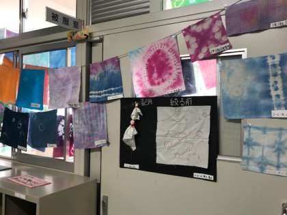 家庭科の展示作品です。マスクや絞り染め、絵本などそれぞれの学年で取り組んだ作品を展示しています。見学している生徒のみなさんも他学年の作品に興味津々です。