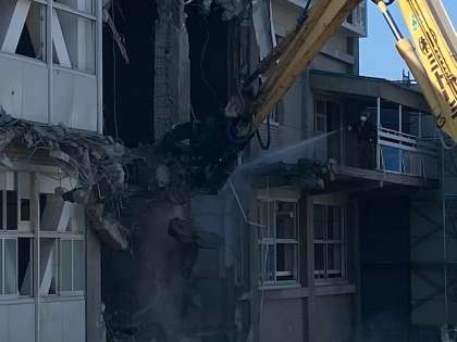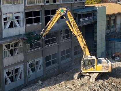 初めに3階の講堂に付随していたベランダに、重機のはさみがかみついて作業開始となりました。幅2メートルほどのベランダは、あっという間にちぎられて落下していきました。重機は横移動を繰り返しながら、大量の放水を浴びての作業でした。