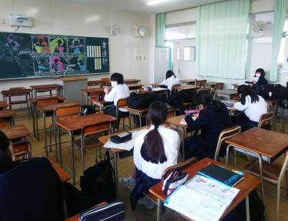 写真は、相談の順番を待っている1年生の生徒のようすです。指定された場所で、きちんと自習をしています。