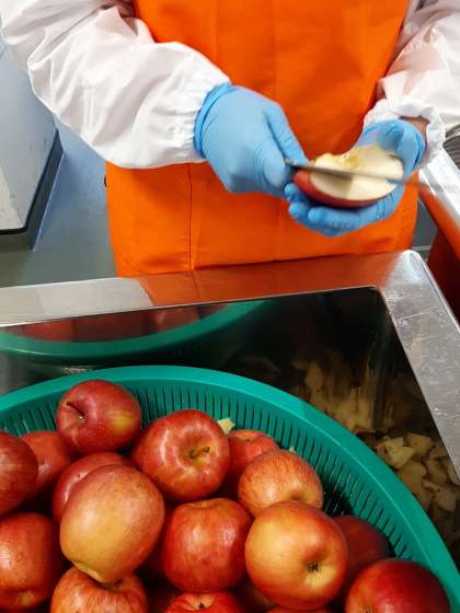 写真は、給食調理員さんがりんごを4分の1に切り分け、芯を取っている場面です。