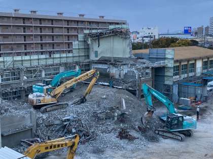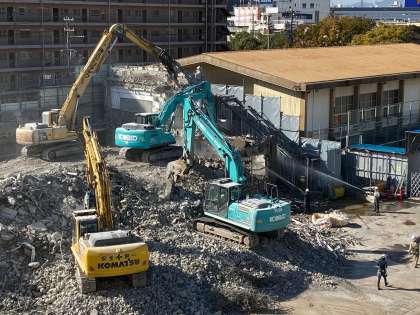 先週末から今週にかけて、講堂の体育館側にそびえたっていた大壁面の解体が行われました。