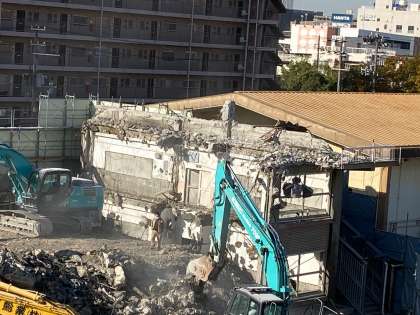 初めに講堂舞台奥の壁面の右半分の解体から始まり、左半分そして2階教室部分が切り取られてゆきました。体育館が今まで以上によく見えるようになりました。