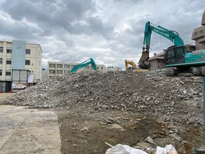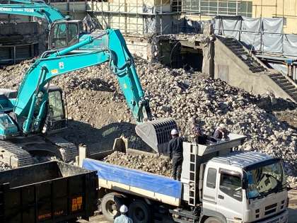 工事現場では毎日、コンクリートの柱や壁が細かく砕く作業が続いています。コンクリート片は細かくなってきて、こぶし大の大きさや砕石となって山のように積み上げられています。山の向こう斜面で作業している重機が、隠れてしまうほどの高さになっていました。