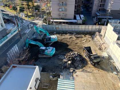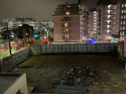 夕暮れ時には、フェンス越しに交差点の信号機や、近接マンションのクリスマスのイルミネーションもよく見えるようになりました。プール建設を待つばかりとなりました。