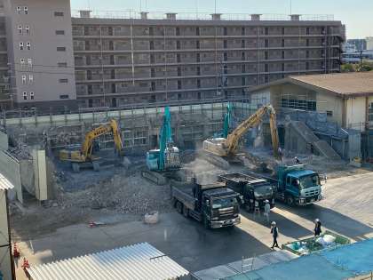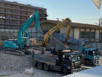 ダンプカーによる搬出が進むとともに、コンクリートガラ山の運動場側に余裕ができできてきました。すかさず奥に積みあがったガラが、複数の重機を経て手前に移し替えられていきます。コンビネーションよろしく流れ作業のようなスムーズな連携です。