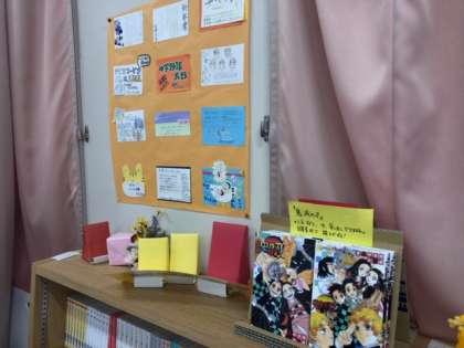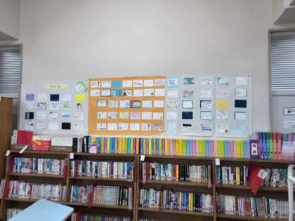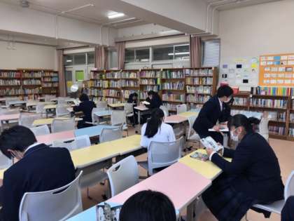 お昼休みの図書館のようすです。静かに本を読んだり勉強したりする姿が見られます。部屋の壁には授業で取り組んだ本の紹介が掲示されています。