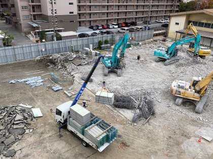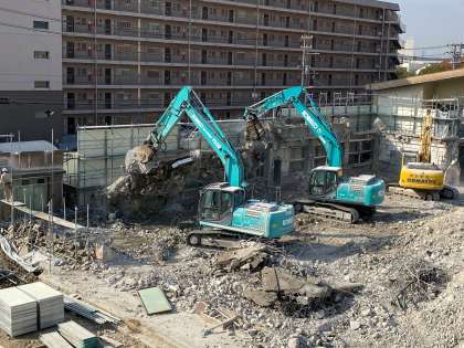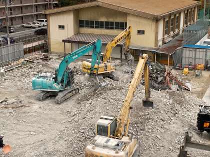 3号館解体工事で最後まで残っていた道路側の1階部分の壁面の解体が、12月12日(土)に行われました。大きなはさみを持った重機2台が壁面を切り取ると、大音響を立てて横倒しとなり、粉塵を巻き上げていました。